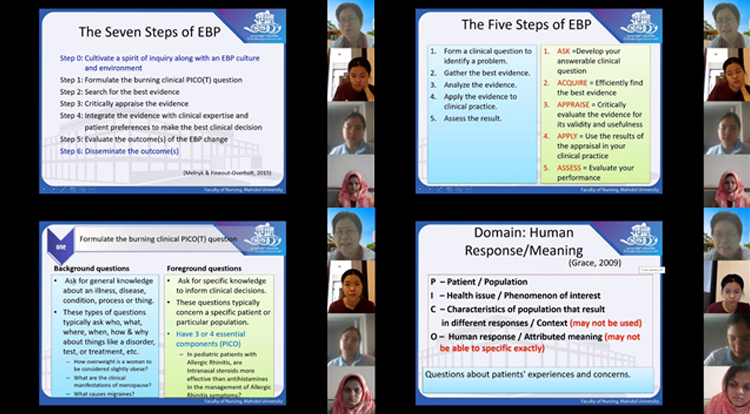 On August 9th, 2022, Assoc.Prof.Dr.Sudaporn Payakkaraung gave a special lecture "Introduction to Evidence-based Practice" to 2022 MNS students via online video conference, Microsoft Teams. This class prepared students to develop quality of nursing practice with concern of effectiveness of care, cost effectiveness, and codes of professional ethics.