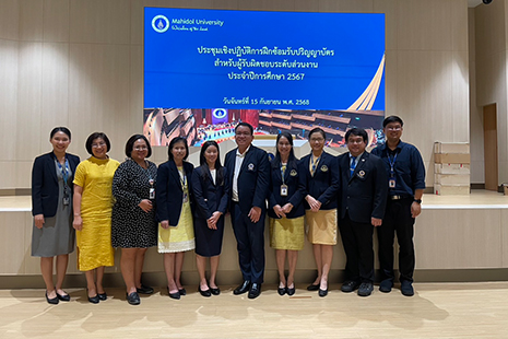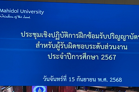 เมื่อวันจันทร์ที่ 15 กันยายน 2568 เวลา 13.30 – 16.00 น. ผู้บริหารและคณาจารย์ คณะพยาบาลศาสตร์ ร่วมเป็นคณะทำงานสาธิตการฝึกซ้อมรับพระราชทานปริญญาบัตร ประจำปีการศึกษา 2567 ในการประชุมเชิงปฏิบัติการ “การฝึกซ้อมรับพระราชทานปริญญาบัตร สำหรับผู้รับผิดชอบระดับส่วนงาน” ณ ห้องบรรยายศาสตราจารย์ นายแพทย์กษาน จาติกวิช สำนักงานอธิการบดี มหาวิทยาลัยมหิดล ศาลายา