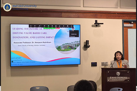 เมื่อวันศุกร์ที่ 19 กันยายน 2568 รองศาสตราจารย์ ดร.เอมพร รตินธร คณบดีคณะพยาบาลศาสตร์ มหาวิทยาลัยมหิดล ได้รับเชิญให้กล่าวปาฐกถาที่มหาวิทยาลัยจอห์นส ฮอปกินส์ (Johns Hopkins University) สหรัฐอเมริกา ในหัวข้อ "เป็นผู้นำแห่งอนาคตการพยาบาล: ขับเคลื่อนคุณค่า, นวัตกรรม, และผลกระทบที่ยั่งยืน" (Leading the Future of Nursing: Driving Value, Innovation, & Lasting Impact) เน้นย้ำบทบาทสำคัญของพยาบาลในการกำหนดทิศทางระบบสุขภาพโลก โดยชี้ให้เห็นถึงความสำคัญของการยกระดับการดูแลสุขภาพแบบเน้นคุณค่า (value-based healthcare) การนำนวัตกรรมและเทคโนโลยีมาใช้ รวมถึงการพัฒนาภาวะผู้นำที่ยั่งยืนเพื่อสร้างผลกระทบที่ยาวนาน