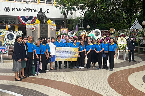 วันที่ 24 กันยายน 2568 โครงการส่งเสริมสุขภาพผู้สูงอายุ คณะพยาบาลศาสตร์ มหาวิทยาลัยมหิดล นำโดย รองศาสตราจารย์ ดร.วิราพรรณ วิโรจน์รัตน์ หัวหน้าภาควิชาการพยาบาลรากฐาน พร้อมด้วยคณาจารย์จากภาควิชาฯ คุณฉวี เพชรดี และสมาชิกโครงการฯ ร่วมพิธีวางพวงมาลาเนื่องใน วันมหิดล ณ ลานพระราชานุสาวรีย์สมเด็จพระมหิตลาธิเบศร อดุลยเดชวิกรม พระบรมราชชนก โรงพยาบาลศิริราช