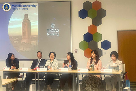 หลังจากการประชุมวิชาการ รองศาสตราจารย์ ดร.เอมพร รตินธร คณบดีคณะพยาบาลศาสตร์ มหาวิทยาลัยมหิดล พร้อมด้วยคณะผู้บริหาร ได้แก่ รองศาสตราจารย์ ดร.อรวมน ศรียุกตศุทธ รองคณบดีฝ่ายบัณฑิตศึกษา ผู้ช่วยศาสตราจารย์ ดร.สุภาภัค เภตราสุวรรณ รองคณบดีฝ่ายวิเทศสัมพันธ์และสื่อสารองค์กร และผู้ช่วยศาสตราจารย์ ดร.ฐิติพงษ์ ตันคำปวน รองคณบดีฝ่ายวิจัย ได้ร่วมประชุมหารือกับผู้บริหารวิทยาลัยพยาบาลศาสตร์ UT Austin เพื่อสำรวจโอกาสในการสร้างความร่วมมือทางวิชาการ, การแลกเปลี่ยนคณาจารย์และนักศึกษา, และการริเริ่มโครงการวิจัยร่วมกัน