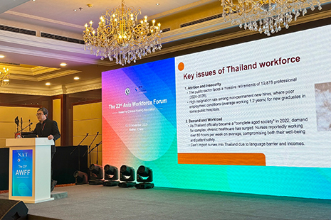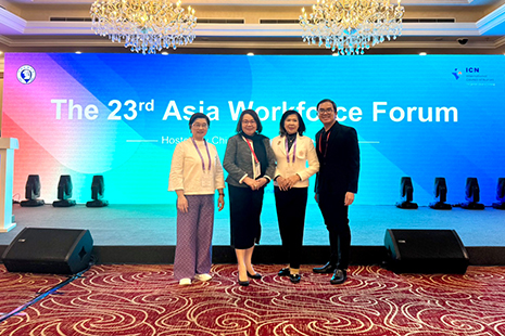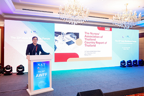 วันที่ 13 พฤศจิกายน 2568 ผู้ช่วยศาสตราจารย์ ดร. ฐิติพงษ์ ตันคำปวน รองคณบดีฝ่ายวิจัย และกรรมการฝ่ายวิเทศสัมพันธ์ สมาคมพยาบาลแห่งประเทศไทย ในพระราชูปถัมภ์สมเด็จพระศรีนครินทราบรมราชชนนี เข้าร่วมนำเสนอและอภิปรายสถานการณ์กำลังคนของพยาบาลวิชาชีพในประเทศไทย และบทบาทของสมาคมพยาบาลแห่งประเทศไทยฯ ในการพัฒนาวิชาชีพการพยาบาล ร่วมกับสมาคมพยาบาลแห่งประเทศไทยฯ นำโดย ศาสตราจารย์ ดร. ศิริอร สินธุ นายกสมาคมพยาบาลแห่งประเทศไทยฯ เข้าร่วมประชุม “Asia Workforce Forum (AWFF) cohosted with the International Council of Nurses (ICN)” ครั้งที่ 23 ระหว่างวันที่ 12-13 พฤศจิกายน 2568 จัดโดย Chinese Nursing Association และประชุม “Alliance of Asian Nurses’ Association (AANA) Meeting” ครั้งที่ 19 ระหว่างวันที่ 14 พฤศจิกายน 2568 จัดโดย Nurses Association of Macau โดยมีสมาคมพยาบาลของกลุ่มประเทศในทวีปเอเซีย รวม 13 ประเทศ ณ กรุงปักกิ่ง สาธารณรัฐประชาชนจีน