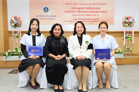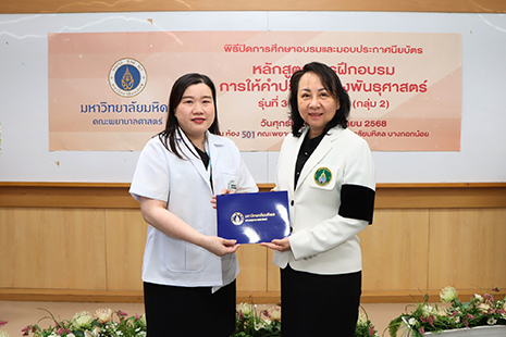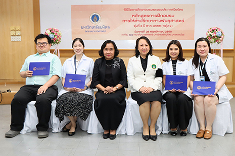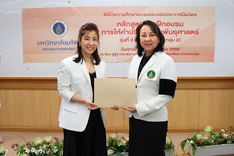 วันที่ 28 พฤศจิกายน 2568 คณะพยาบาลศาสตร์ มหาวิทยาลัยมหิดล จัดพิธีปิดและมอบประกาศนียบัตรให้แก่ผู้ผ่านการอบรม “หลักสูตรการให้คำปรึกษาทางพันธุศาสตร์ รุ่นที่ 3” ทั้งสองกลุ่ม ภายใต้ความร่วมมือจากสถาบันวิจัยระบบสาธารณสุข (สวรส.) เพื่อยกระดับกำลังคนทางสุขภาพให้ตอบโจทย์ความท้าทายในยุคที่เทคโนโลยีจีโนมมีบทบาทเพิ่มขึ้นอย่างก้าวกระโดด พิธีครั้งนี้ได้รับเกียรติจาก รองศาสตราจารย์ ดร.เอมพร รตินธร คณบดีคณะพยาบาลศาสตร์ มหาวิทยาลัยมหิดล เป็นประธานในพิธีปิด พร้อมกล่าวชื่นชมความมุ่งมั่นของผู้เข้าอบรมทั้ง 21 คน ประกอบด้วยแพทย์ นักเทคนิคการแพทย์ และพยาบาลวิชาชีพ ที่อุทิศเวลาเพื่อเพิ่มพูนทักษะด้านพันธุศาสตร์เชิงคลินิก และได้รับการพัฒนาสู่บทบาท “ผู้ให้คำปรึกษาทางพันธุกรรมเบื้องต้น (Genetic Counselor)” ซึ่งเป็นกำลังสำคัญในการดูแลผู้ป่วย ครอบครัว หญิงตั้งครรภ์ และประชาชนที่ต้องการข้อมูลด้านพันธุกรรมในการตัดสินใจด้านสุขภาพ