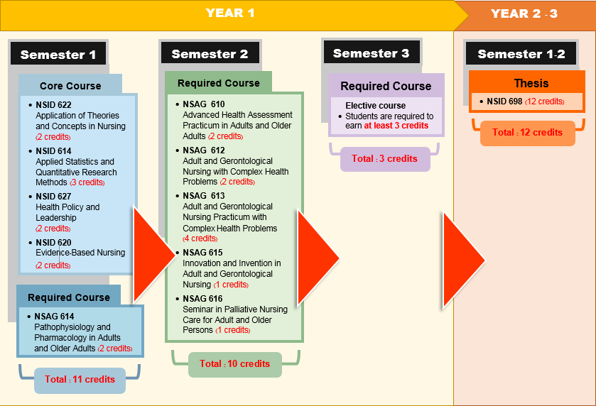 หลักสูตรพยาบาลศาสตรมหาบัณฑิต สาขาการพยาบาลผู้ใหญ่และผู้สูงอายุ จัดการศึกษาที่มุ่งผลสัมฤทธิ์ของผู้เรียน โดยใช้การเรียนรู้เป็นศูนย์กลาง เพื่อให้ผู้เรียนสามารถสร้างเสริมความรู้ ความสามารถและทักษะใหม่ได้ด้วยตนเอง ในการแก้ปัญหาสุขภาพที่ซับซ้อน และให้การดูแลสุขภาพผู้ใหญ่ ผู้สูงอายุและครอบครัวอย่างต่อเนื่อง บนพื้นฐานของกฎหมาย จริยธรรม จรรยาบรรณ และมาตรฐานวิชาชีพ สอดคล้องกับระบบสุขภาพของประเทศ และความต้องการของสังคม เป็นผลให้เกิดองค์ความรู้ในสาขาวิชาชีพ ที่นำไปสู่การพัฒนาองค์กร สถาบัน ให้ประสบความสำเร็จทั้งในด้านผลสัมฤทธิ์ของการปฏิบัติและคุณภาพอย่างต่อเนื่อง