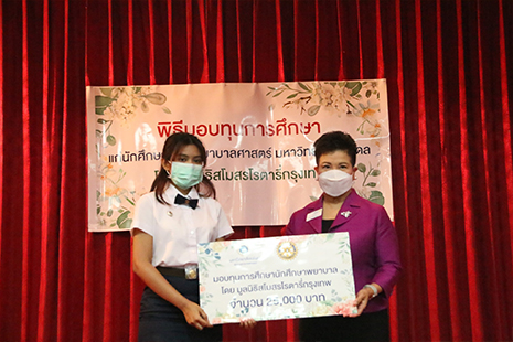 วันที่ 8 มิถุนายน 2565 ผู้ช่วยศาสตราจารย์ธิราวรรณ เชื้อตาเล็ง รองคณบดีฝ่ายพัฒนานักศึกษา คณะพยาบาลศาสตร์ มหาวิทยาลัยมหิดล กล่าวต้อนรับผู้แทนจากสโมสรโรตารีกรุงเทพ คุณจุไรรัตน์ ปันยารชุน คุณกัลยา ลี้อิสสรพงษ์ อดีตนายกสโมสรโรตารี่กรุงเทพ และคุณกิติมา ศิริไชย ผู้อำนวยการฝ่ายกิจกรรมส่งเสริมอาชีพ โดยทั้งสามท่านเป็นตัวแทนมอบทุนการศึกษาให้กับนักศึกษาพยาบาลหลักสูตรพยาบาลศาสตรบัณฑิต ชั้นปีที่ 2 จำนวน 7 คน ทุนละ. 25000 บาท รวมทั้งสิ้น175,000 บาท ทั้งนี้คุณจุไรรัตน์ ปันยารชุน อดีตนายกสโมสรโรตารี่กรุงเทพ ได้กล่าวให้โอวาทแก่นักศึกษา ณ ห้องประชุม ดร.ทัศนา บุญทอง หอพักคณะพยาบาลศาสตร์ บางขุนนนท์