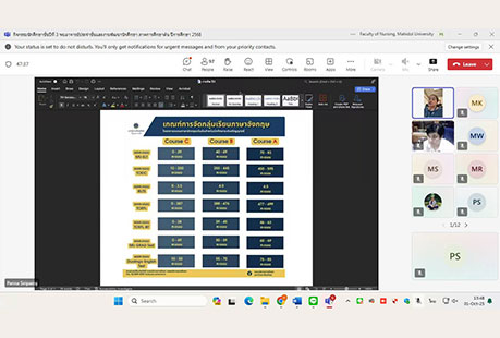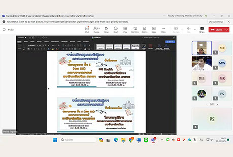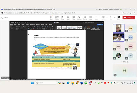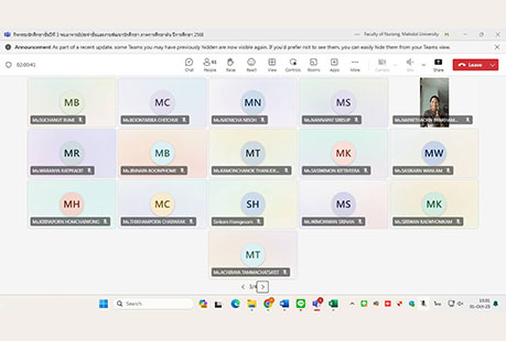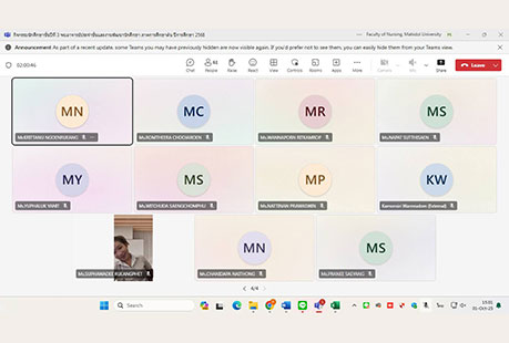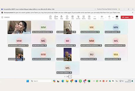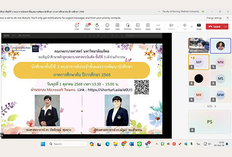 เมื่อวันที่ 1 ตุลาคม 2568 งานพัฒนานักศึกษา คณะพยาบาลศาสตร์ มหาวิทยาลัยมหิดล ได้จัดกิจกรรม “นักศึกษาชั้นปีที่ 3 พบอาจารย์ประจำชั้นและงานพัฒนานักศึกษา ภาคการศึกษาต้น ปีการศึกษา 2568” ผ่านระบบออนไลน์ Microsoft Teams โดยมีรองศาสตราจารย์ ดร.วไลลักษณ์ พุ่มพวง ผู้ช่วยศาสตราจารย์ ดร.ณัฐมา ทองธีรธรรม อาจารย์ประจำชั้นของนักศึกษาชั้นปี 3 ผู้ช่วยศาสตราจารย์ ธิราวรรณ เชื้อตาเล็ง รองคณบดีฝ่ายพัฒนานักศึกษา และผู้ช่วยศาสตราจารย์ ดร.เพ็ญจันทร์ สิทธิปรีชาชาญ ผู้ช่วยคณบดีฝ่ายพัฒนานักศึกษา ร่วมพูดคุยแลกเปลี่ยนความคิดเห็นและสร้างความเข้าใจในแนวทางการเรียนและการพัฒนาตนเองในด้านต่าง ๆ เพื่อส่งเสริมการเรียนรู้และพัฒนาศักยภาพของนักศึกษาพยาบาลชั้นปีที่ 3 โดยหัวข้อของการพูดคุยแลกเปลี่ยนที่สำคัญ ได้แก่ แนวทางการสอบผ่านเกณฑ์มาตรฐานความรู้ภาษาอังกฤษและการติดตามชั่วโมงกิจกรรม (Activity Transcript) ก่อนสำเร็จการศึกษา การให้คำแนะนำขึ้นฝึกบนหอผู้ป่วย กิจกรรมครั้งนี้เป็นโอกาสให้นักศึกษาได้พบปะและพูดคุยกับอาจารย์ประจำชั้นอย่างใกล้ชิด พร้อมทั้งได้รับข้อมูลและคำแนะนำที่สำคัญสำหรับการพัฒนาตนเองในด้านการเรียนและความพร้อมสำหรับอนาคตในสายวิชาชีพพยาบาล