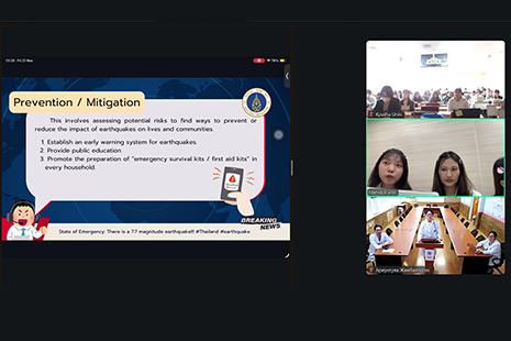วันที่ 21 พฤศจิกายน 2568 นักศึกษาหลักสูตรปริญญาตรี คณะพยาบาลศาสตร์ มหาวิทยาลัยมหิดล ได้เข้าร่วมกิจกรรม The 20th International Forum of Health Sciences in Kyushu University ซึ่งจัดโดย Department of Health Sciences, Kyushu University ประเทศญี่ปุ่น ผ่านโปรแกรม Zoom Meeting โดยมีกิจกรรม “Student Meeting” ซึ่งจัดแบบ Hybrid ที่เปิดโอกาสให้นักศึกษาพยาบาลชาวไทย ญี่ปุ่น และมองโกเลีย ได้แลกเปลี่ยนความรู้และประสบการณ์จากประเทศของตนเอง ภายใต้ธีม Disaster Nursing โดยในกิจกรรมนี้ มีตัวแทนนักศึกษาหลักสูตรปริญญาตรี จากคณะพยาบาลศาสตร์ มหาวิทยาลัยมหิดล จำนวน 4 คน ได้แก่ 1) นางสาวประวีณา หาสีโน 6609080 2) นางสาวณศวรรธน์ สุนทรานุยุตกิจ 6609305 3) นางสาวนิธดา ยศจนา 6609310 และ 4) นางสาวศมาวดี ศักดิ์ศรี 6609326 ร่วมกันนำเสนอหัวข้อ “Earthquake Shakes Bangkok”
